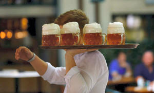 A waiter serves beer in the traditional Schweizerhaus beer garden in