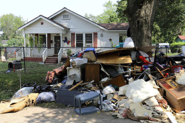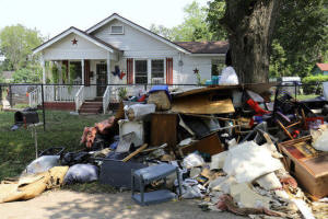 Flood damage from a home is left along the street in the aftermath