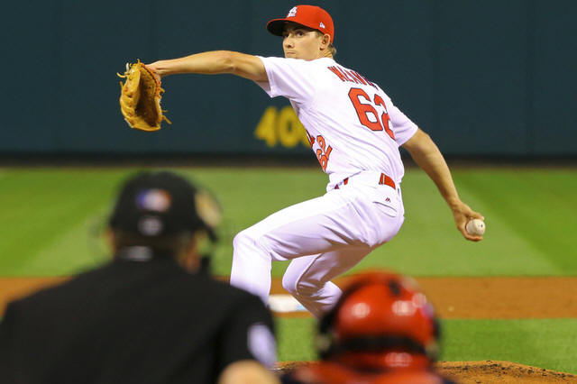 Cardinals starting pitcher Luke Weaver (62) throws against the