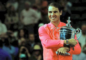Rafael Nadal of Spain holds the trophy after defeating Kevin