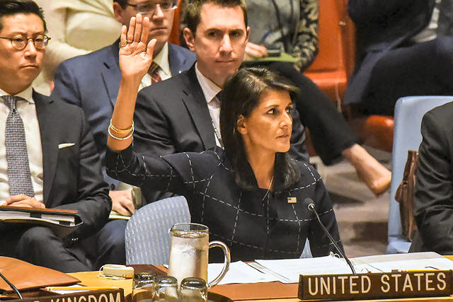 U.S. Ambassador to the UN, Nikki Haley votes during a United Nations