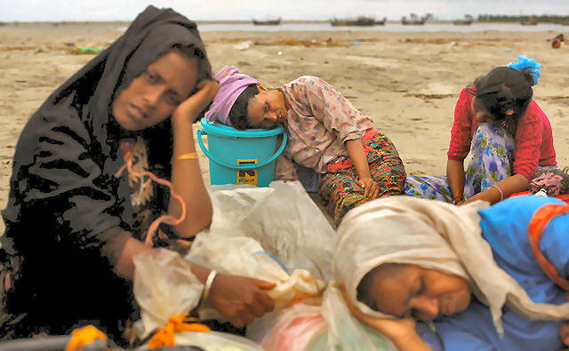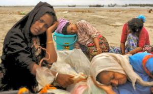 Exhausted Rohingya refugees rest on the shore after crossing the