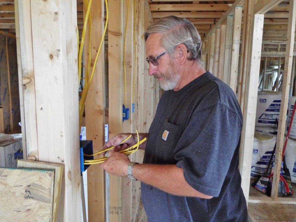 Zumwalt reviews electrical wiring to a light switch installed by a crew earlier in the day on Saturday, Aug 26th.