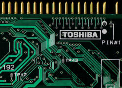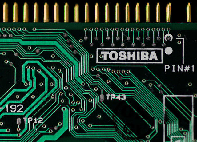 A logo of Toshiba Corp is seen on a printed circuit board in this