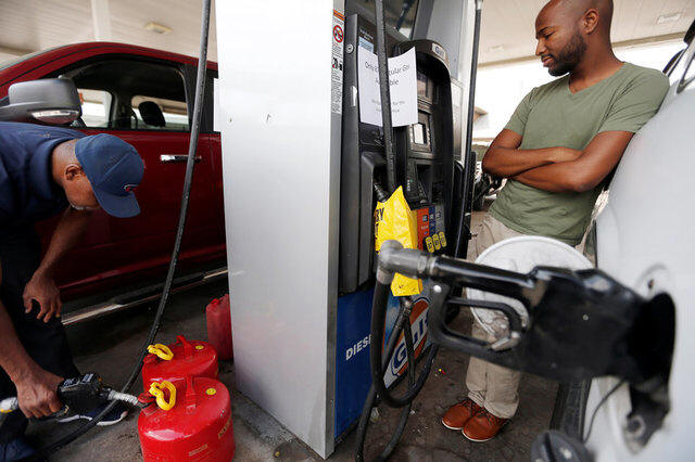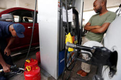 Cains Lawrence (L), and Derrick Washington fill up gasoline cans and
