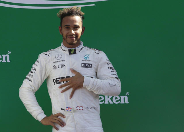 Mercedes' Lewis Hamilton celebrates on the podium REUTERS/Max Rossi