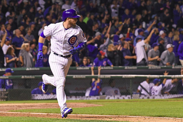 Cubs center fielder Ian Happ (8) runs the bases on his home run