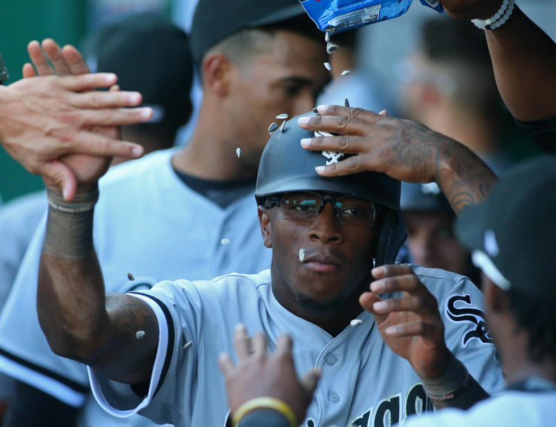 Sox second baseman Yoan Moncada (10) is congratulated in