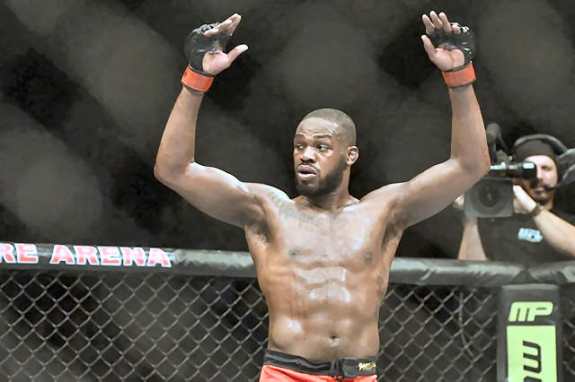 Jon Jones puts his arms in the air after the UFC light