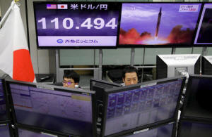 monitors showing TV news on North Korea's threat (R) and the