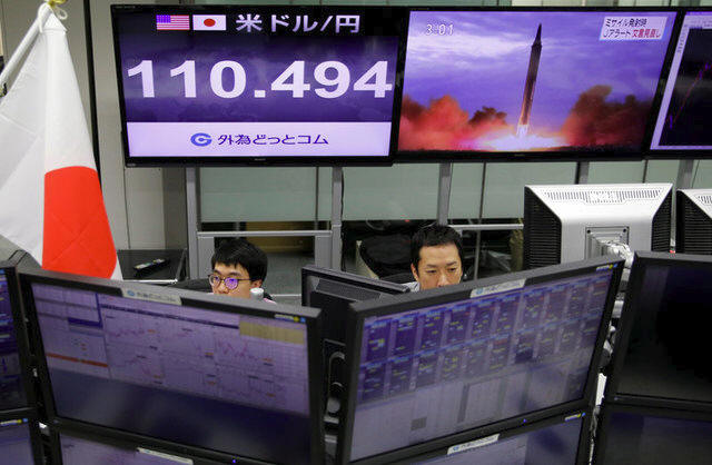 Employees of a foreign exchange trading company work in front of