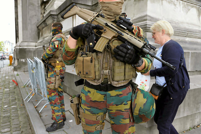 Belgian soldiers stand guard as they patrol outside the Palace of