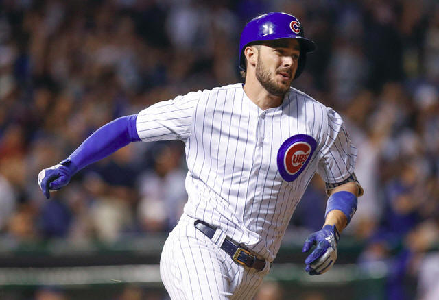 Cubs third baseman Kris Bryant (17) runs to second base after