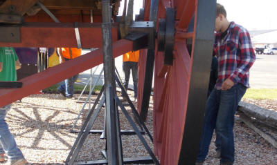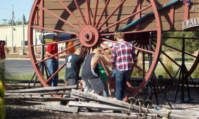Railsplitter Covered Wagon doing repairs caused by recent wind