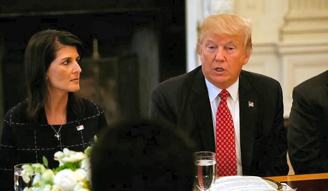 With U.S. Ambassador to the United Nations Nikki Haley at his side