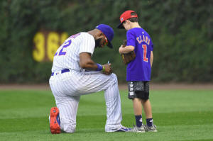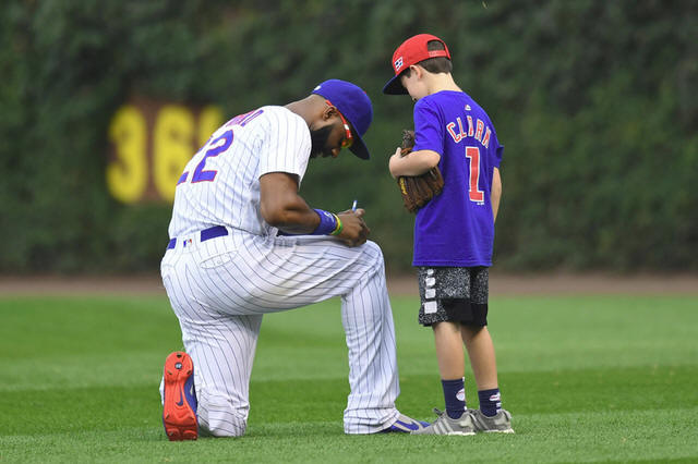 Cubs right fielder Jason Heyward (22) signs an autograph for a young