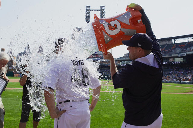 Tigers starting pitcher Matthew Boyd (48) is doused with water by