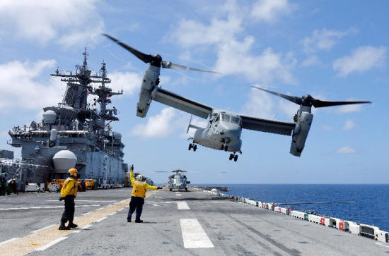 Marine Corps MV-22B Osprey takes off from the USS