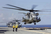 A Marine Corps CH-53 Super Stallion lifts off from the USS