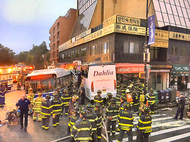 A New York City transit bus and a Dahlia tour bus collided,