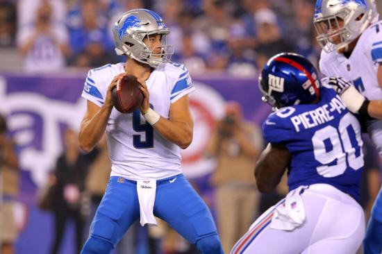 quarterback Matthew Stafford (9) drops back to pass