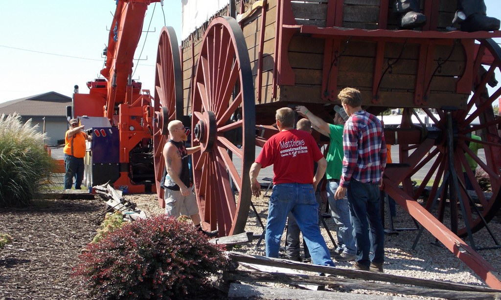 Railsplitter Covered Wagon doing repairs caused by recent wind
