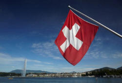 A Swiss flag is pictured next to the Jet d'Eau (water fountain), and