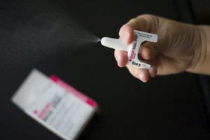 A nurse demonstrates the application of the NARCAN nasal spray