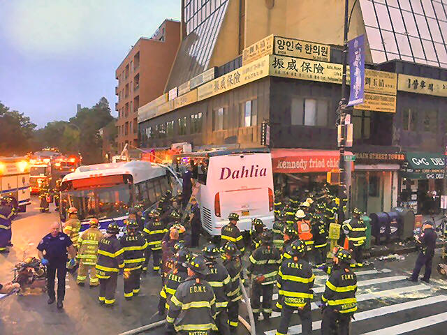 A New York City transit bus and a Dahlia tour bus collided, spinning