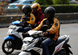 Uber motorcycle taxi drivers drive on a street in Jakarta, Indonesia