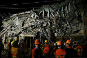 Rescuers work at the site of a collapsed building after an