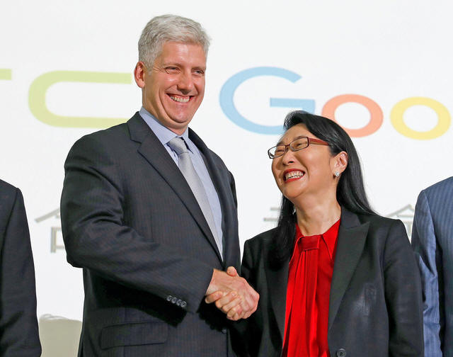 Google hardware executive Rick Osterloh (L) shakes hand with HTC CEO