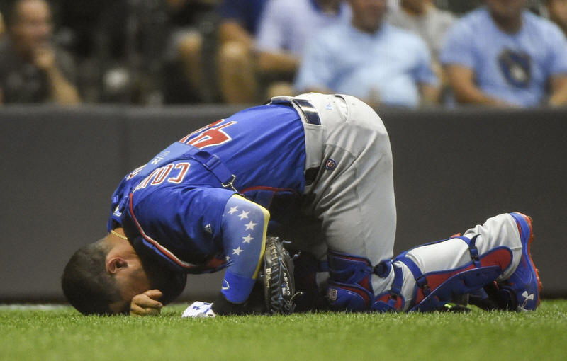 Cubs catcher Willson Contreras (40) writhes in pain after being