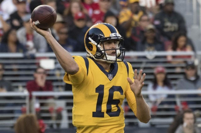 Rams quarterback Jared Goff (16) passes the football against the