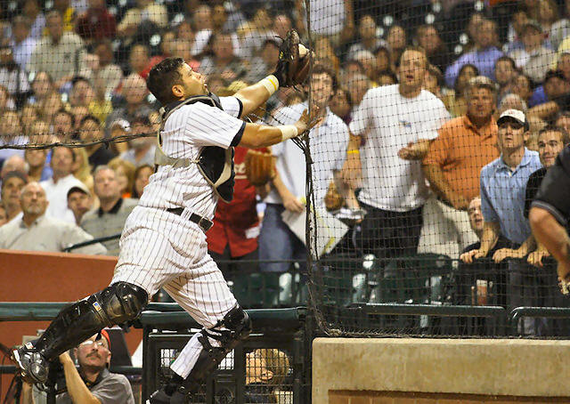 Houston Astros catcher Raul Chavez goes into the netting to catch a