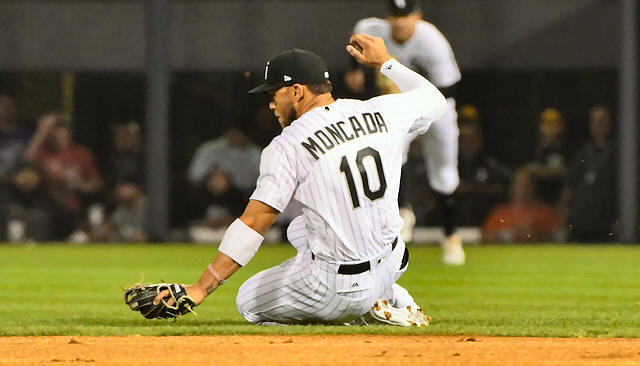 White Sox second baseman Yoan Moncada (10) stops a ball hit by