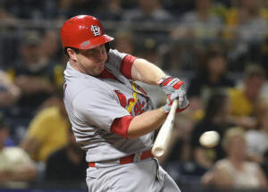 Cardinals pinch hitter Jedd Gyorko (3) hits an RBI single against