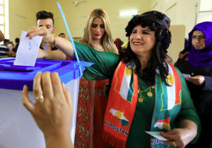 A woman casts her vote at a polling station during Kurds