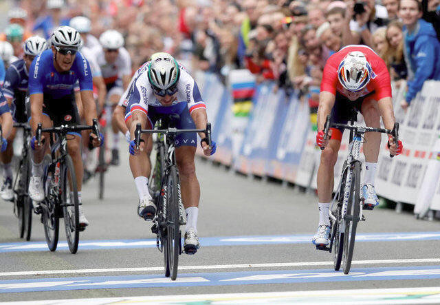 Peter Sagan (C) of Slovakia finishes in first and Alexander Kristoff