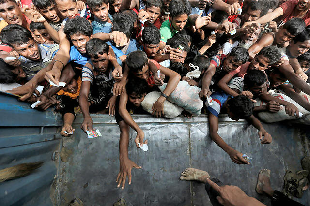 Rohingya refugees wait to receive aid in Cox's Bazar, Bangladesh