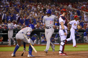 Cubs shortstop Addison Russell (27) scores during the eighth inning