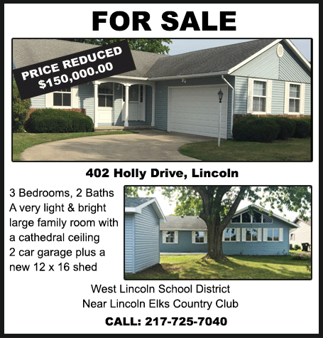 All real estate advertised in the Lincoln Daily News is subject to the Fair Housing Act for 1968 which makes it illegal to advertised "any preference, limitation, or discrimination based on race, color, religion, sex or national origin, or intention to make special preference, limitations, or discrimination."