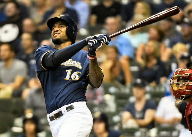 Brewers right fielder Domingo Santana (16) hits a 3-run homer in the