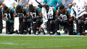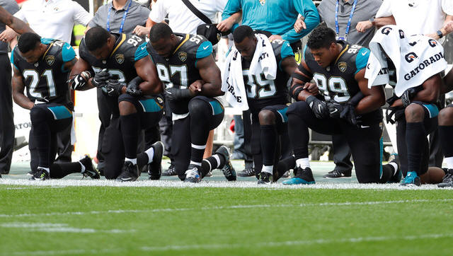 Jacksonville Jaguars players kneel during the U.S. national anthem
