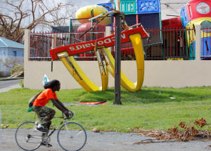 A resident cycles past a fast food restaurant that was badly damaged by Hurricane Maria in St. Croix, U.S. Virgin Islands, September 27, 2017. REUTERS/Jonathan Drake |
