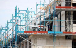 A construction worker adjusts a scaffolding on a construction site