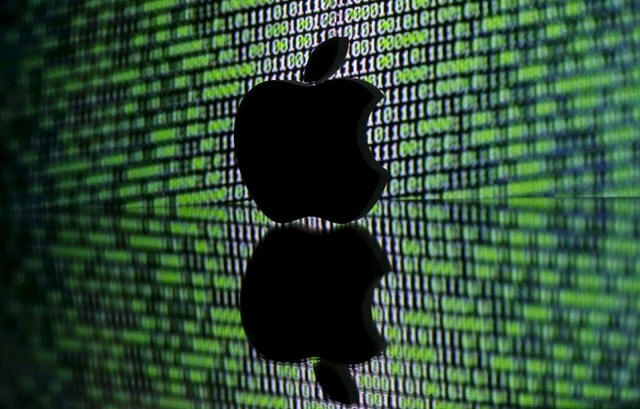 A 3D printed Apple logo is seen in front of a displayed cyber code