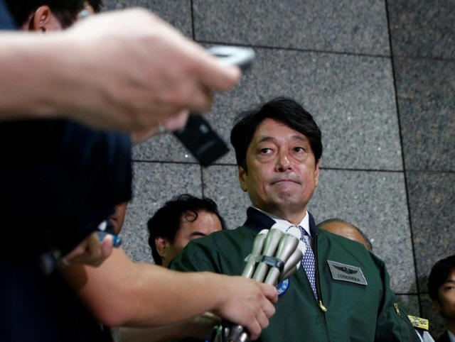 Japan's Defense Minister Itsunori Onodera speaks to reporters after