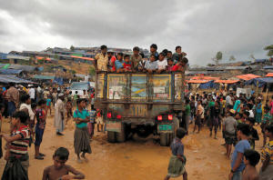 Rohingya refugee children gather on a truck in Cox's Bazar,