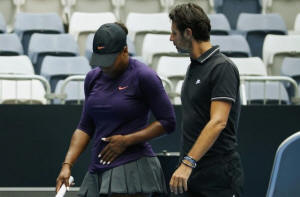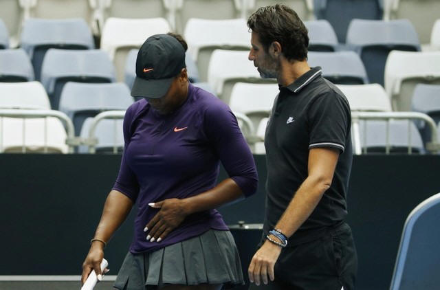 Serena Williams of the U.S. reacts next to her coach Patrick